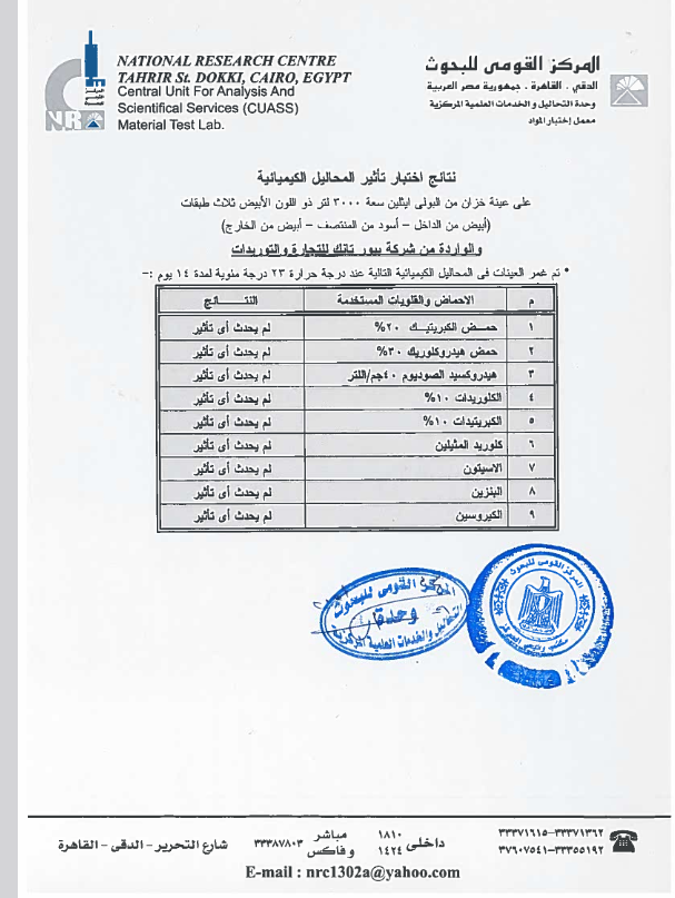 تقدم حماية ممتازة ضد العوامل الجوية والمركبات الكيميائية، بالإضافة إلى الحفاظ على نقاء المواد المخزنة بفضل خصائصها المقاومة للتفاعلات.
